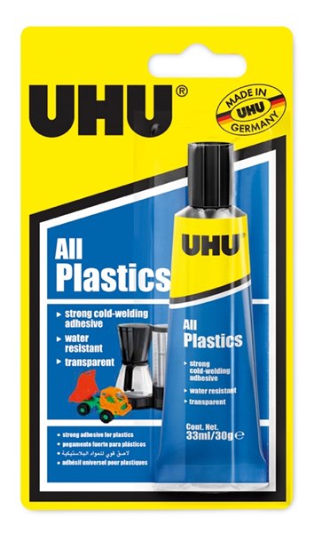 הסוד מאחורי כל פתרון אפקטיבי בעבודות הדבקה, טמון בבחירה חכמה ונכונה של מוצרים איכותיים! בדיוק כמו דבק לפלסטיק מבית UHU. דבק לפלסטיק איכותי, מקצועי ועוצמתי עם טכנולוגיית "ריתוך קר" אשר ממיסה חלק מהפלסטיק יחד עם הדבק ויוצרת חוזק הדבקה מקסימלי. בנוסף, דבק לפלסטיק של UHU בעל התאמה רחבה לכל סוגי הפלסטיק לרבות PVC קשיח, ABS, פוליקרבונט, פלסטיק קשיח ועוד. כל זאת לצד ייבוש מהיר בגוון שקוף. מכיל 33 מ״ל.