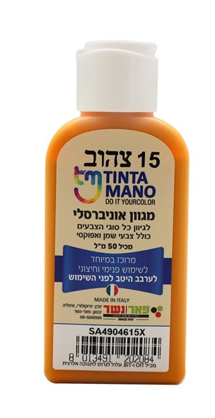 רוצים להפיק צבעים מדהימים וייחודיים לצד חיסכון בעלויות? הכירו את מגוון הצבע האוניברסלי של TINTAMANO. מגוון צבע מקצועי, איכותי ומרוכז במיוחד המאפשר לכם להפיק את גווני הצבע שתמיד חלמתם! כל זאת תוך התאמה אופטימלית לעבודה בצבעים אקריליים, צבעים על בסיס מים, צבעי שמן ואפוקסי. מגיע בצבע צהוב (קוד גוון: 15). מכיל 50 מ״ל.