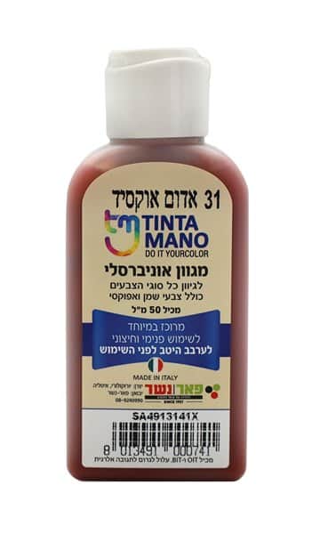 רוצים להפיק צבעים מדהימים וייחודיים לצד חיסכון בעלויות? הכירו את מגוון הצבע האוניברסלי של TINTAMANO. מגוון צבע מקצועי, איכותי ומרוכז במיוחד המאפשר לכם להפיק את גווני הצבע שתמיד חלמתם! כל זאת תוך התאמה אופטימלית לעבודה בצבעים אקריליים, צבעים על בסיס מים, צבעי שמן ואפוקסי. מגיע בצבע אדום אוקסיד (קוד גוון: 31). מכיל 50 מ״ל.