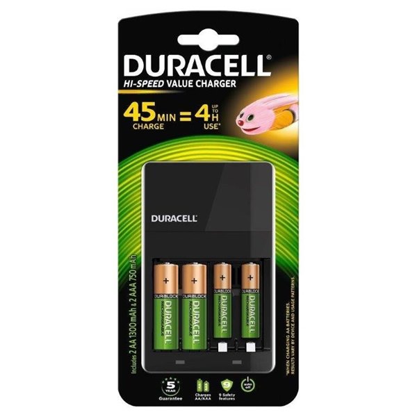 סוללות נטענות אלקליין (1.35V – 1.0V) של Duracell: זוג סוללות AA בהספק של 2500mAh + זוג סוללות AAA בהספק של 850mAh. הסוללות מגיעות טעונות עד כ-12 חודשים ומגיעות עם מטען איכותי ומהיר המטעין את הסוללות תוך 45 דקות בלבד ומספק עוצמה מירבית ל-4 שעות של עבודה. כל זאת לצד מחוון טעינה חלקית עם כיבוי אוטומטי למניעת התחממות.